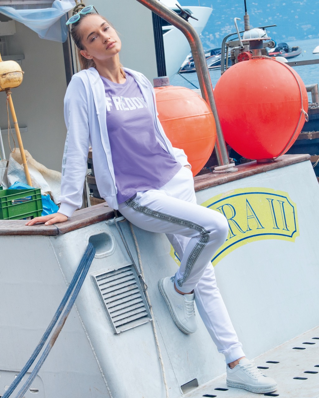 2色のシルバーのルレックスで作られた側面にFREDDYジャカードバンドで装飾された軽量フリースのアスレチックパンツ。